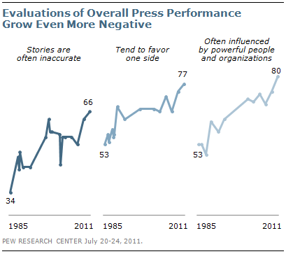 “Fully 66% say news stories often are inaccurate, 77% think that news organizations tend to favor one side, and 80% say news organizations are often influenced by powerful people and organizations.”