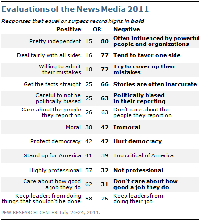 “Negative opinions about the performance of news organizations now equal or surpass all-time highs on nine of 12 core measures the Pew Research Center has been tracking since 1985. ”