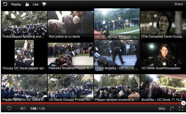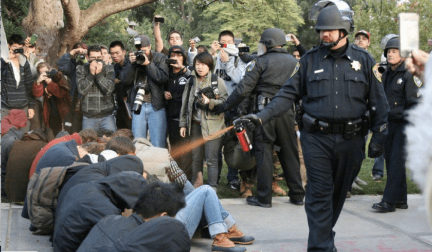 Take a look at this image I grabbed from one of the many crowd shots taken of the police shooting pepper spray at Occupy protestors at UC Davis Saturday. What do you notice about the photographers?