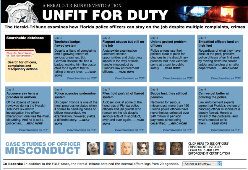 Take a look at this investigation by the Sarasota Herald Tribune in Sarasota, Florida. The small paper uncovered a broken police review system that allows bad cops, even those with repeated complaints in their files about violence, to stay on the job.