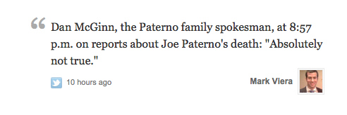 Here we go again, another story that got rolling on Twitter, picked up steam, never got verified and turned out to be wrong. Joe Paterno did not die Saturday afternoon. How did this giant screw-up happen and what should journalists learn from it?