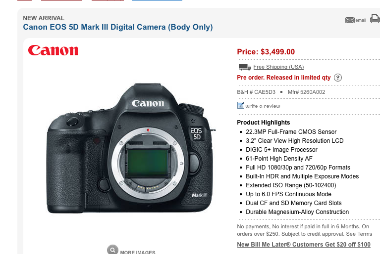 Canon has rolled out its new 5D Mark III DSLR camera. For those of us in the news and education worlds, it could be what we have been waiting for. The price is lower and previous models, the video files are much longer (now 29 min 59 seconds) and NOW this DSLR has an audio jack–meaning we can monitor the audio while we record it. YEA! Why doesn’t Canon understand how HUGE this is? It is not even the key thing they mention in the writeups. It shoots 22mps still.