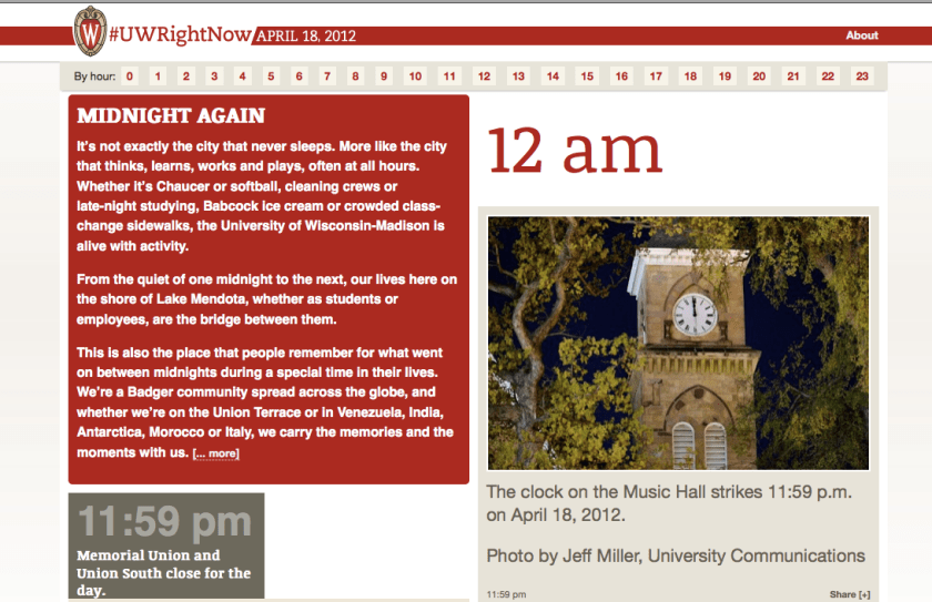 For 24 hours students, faculty, everybody on the UMW campus tweeted, YouTubed and blogged about life on campus. They produced a rich mosaic life college life. Click on image to take a tour.