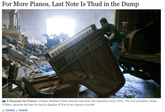 People are writing notes online saying thy wince when watching this story about how NYC piano movers are taking a LOT more pianos to the dump these days because people can’t afford to fix the instruments or don’t have room anymore.