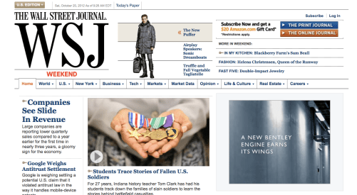 While the Journal puts the text version of the story behind a pay wall, it allows the non-subscriber to experience the video project free. But the Journal puts the user in charge. On the inside page, the wsj.com site allows the user to experience the piece in chunks. The opus open and the three vignettes. Then the user can click through the close-up still images contained in each smaller solider story.