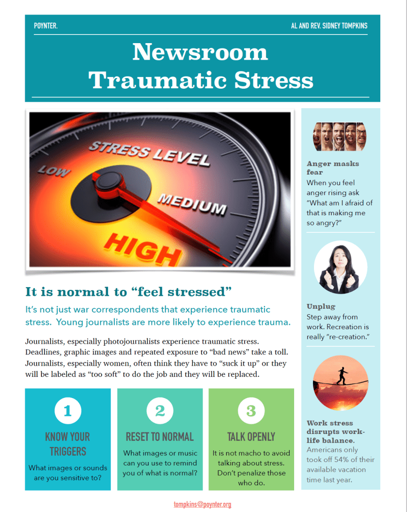 The Reverend Sidney Tompkins and I have been leading conversations with journalists about the stress and trauma of the job. We presented workshops at Investigative Reporters and Editors conference, and at NAHJ/EIJ/RTDNA and workshops for news organizations including Sinclair and NABJ. Here is the managing stress handout that we produced that we hope will start important conversations in newsrooms around the world.